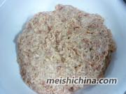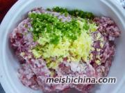 1. 绞肉加入葱姜末、盐、糖、鸡精、胡椒粉、麻油和适量的水搅拌上劲。