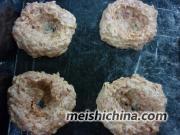 4. 放在平盘上,压扁,用小勺扒一个小窝,大小能容纳一个鹌鹑蛋。