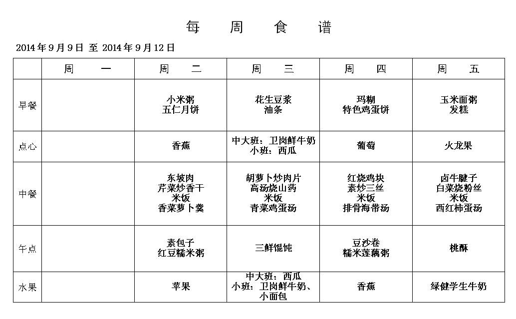 您现在的位置是:徐州市第一实验幼儿园 > 第二周食谱