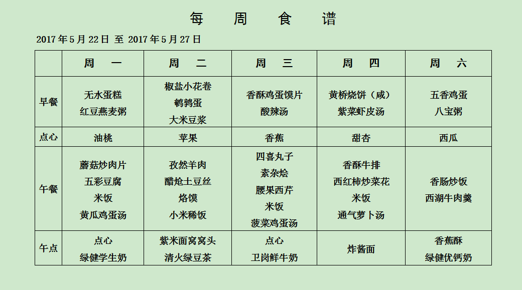 您现在的位置是:徐州市第一实验幼儿园 > 第十五周食谱