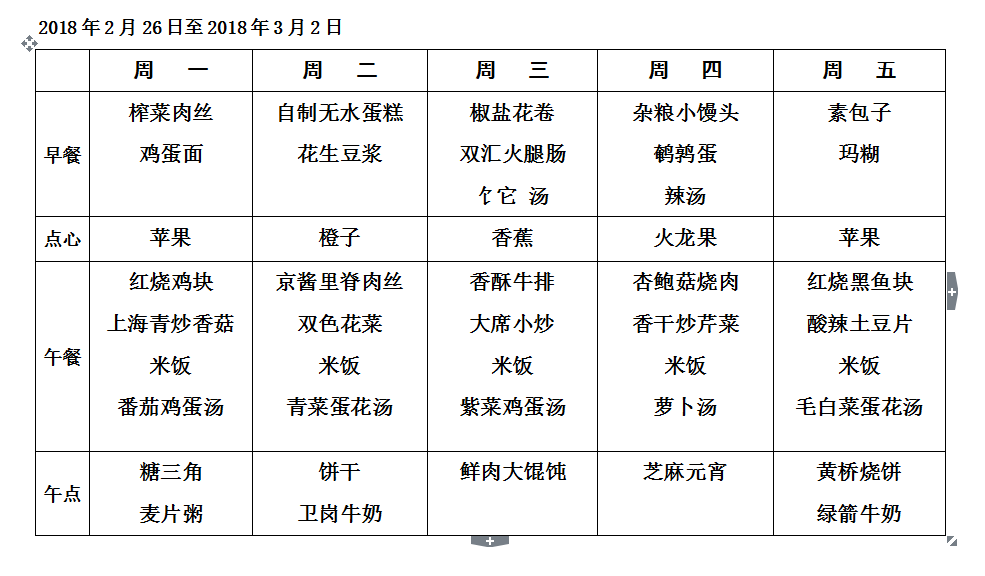 您现在的位置是:徐州市第一实验幼儿园 > 第一周食谱