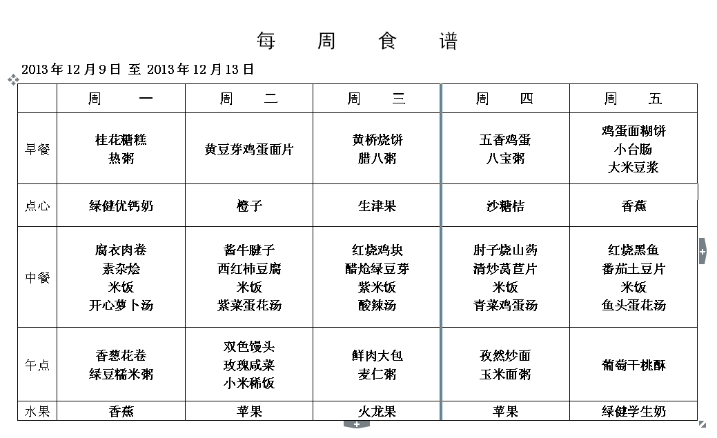 第十五周食谱(2013年12月9日——2013年12月13日)