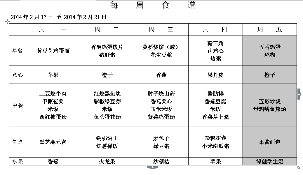 第一周食谱(2014年2月17日——2014年2月21日)