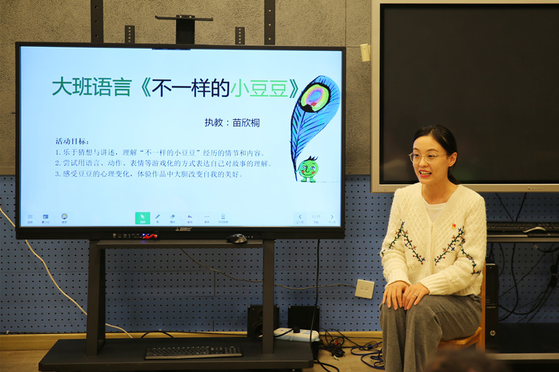 苗老师分享展示了大班语言活动《不一样的小豆豆》,该故事讲述了一颗小豌豆追寻梦想的冒险之旅,它无谓嘲笑,最终勇敢成为了不一样的自己。苗老师引导幼儿在猜想、讲述中理解“不一样的小豆豆”经历的情节和内容,感受豆豆的心理变化,体验作品中大胆改变自我的美好。