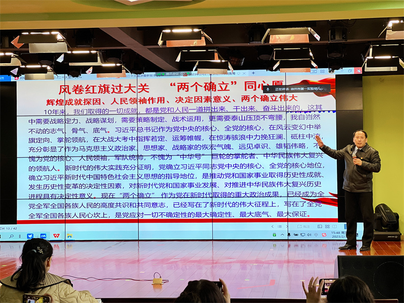 【通讯员:李红】为了深入学习贯彻党的二十大精神,引导教职工更加全面深刻领会其重要意义,在教职工中掀起学习贯彻党的二十大精神热潮,推动党的二十大精神入脑入心、走深走实,2023年2月3日下午,一实幼举办学习贯彻党的二十大精神宣讲报告会,邀请学习贯彻党的二十大精神市委宣讲团成员、徐州工程学院马克思主义学院副院长周海航同志到现场作报告。徐州市第一实验幼儿园副园长郭颂同志主持报告会,幼儿园全体教职工参加了会议。