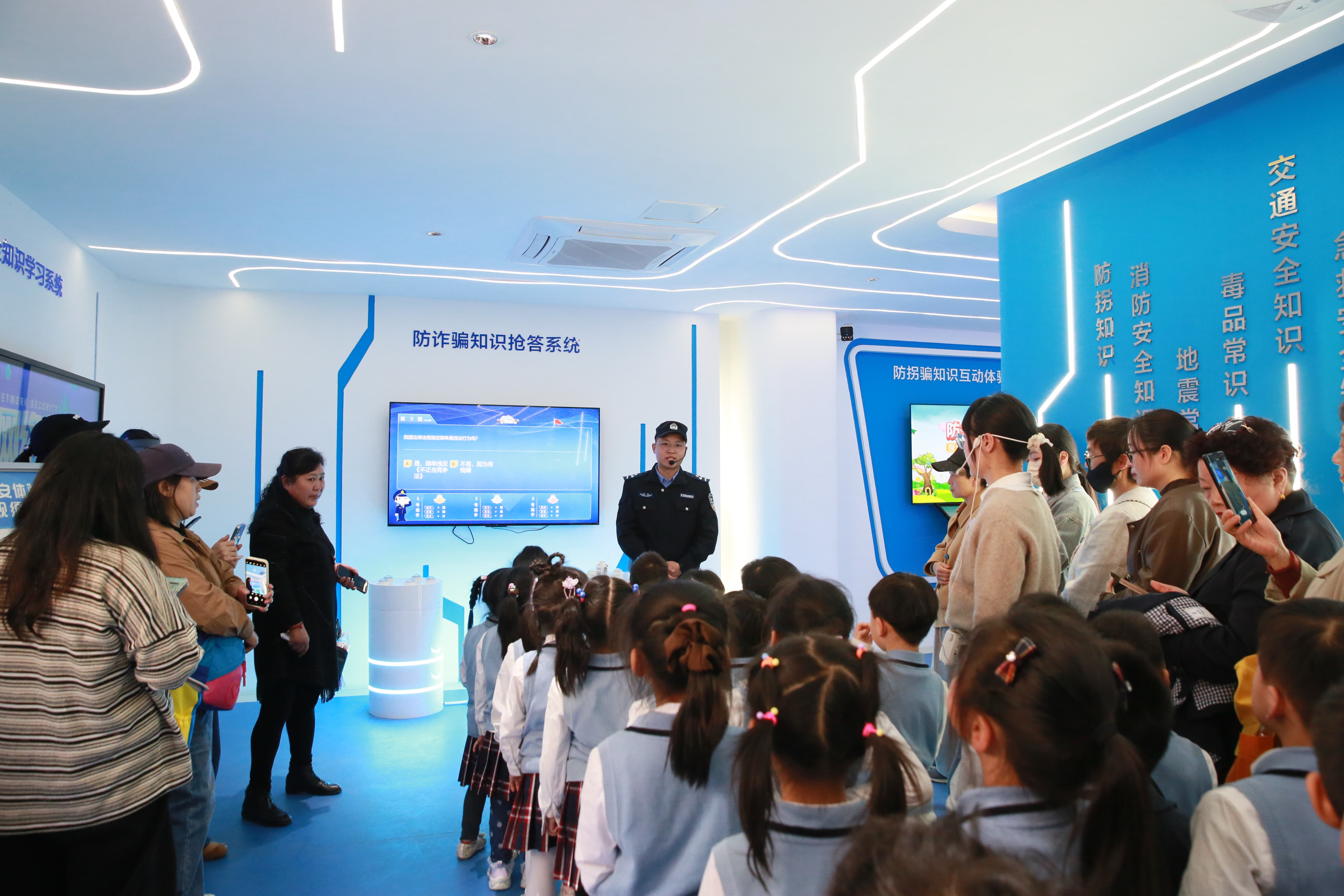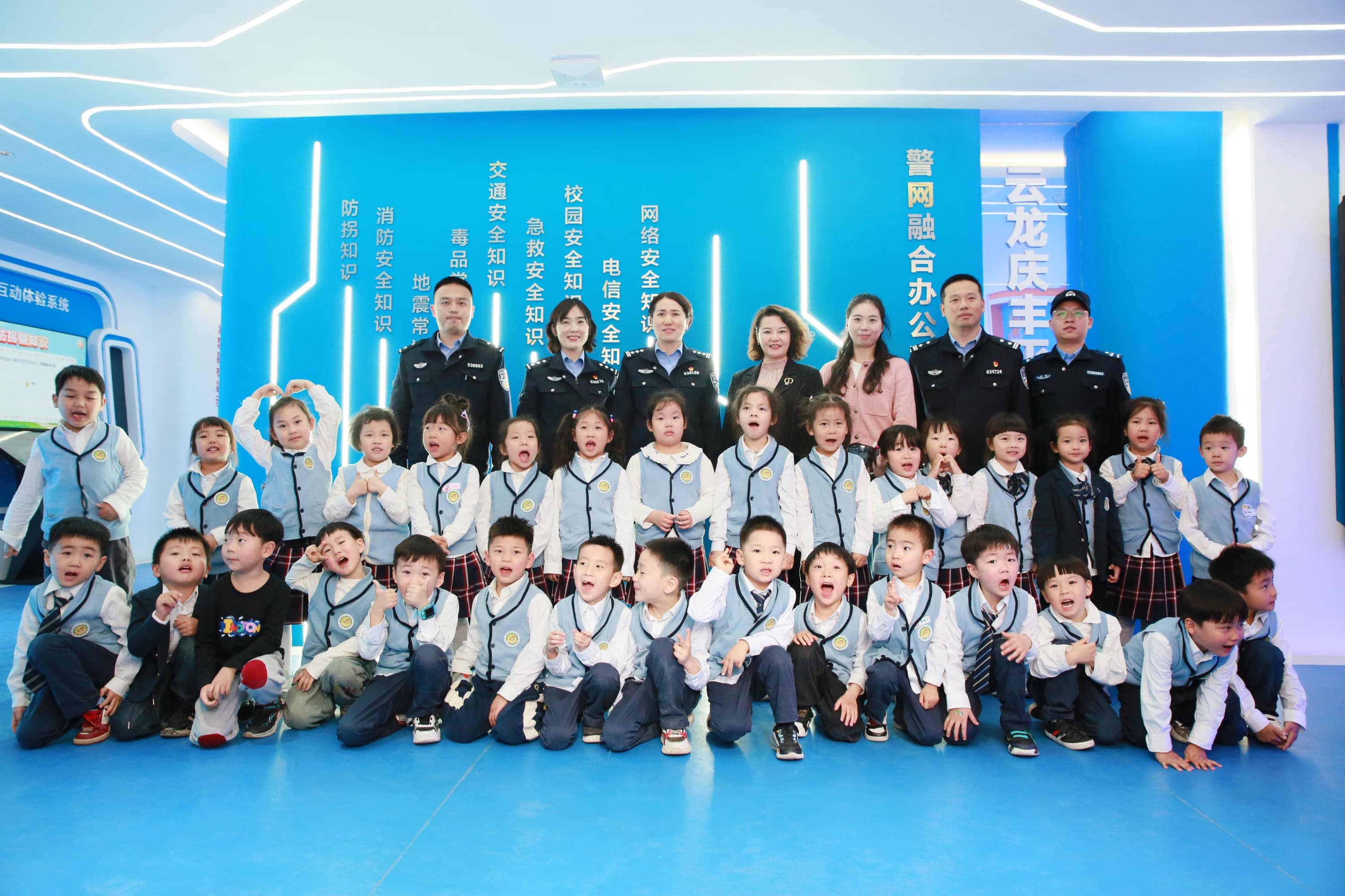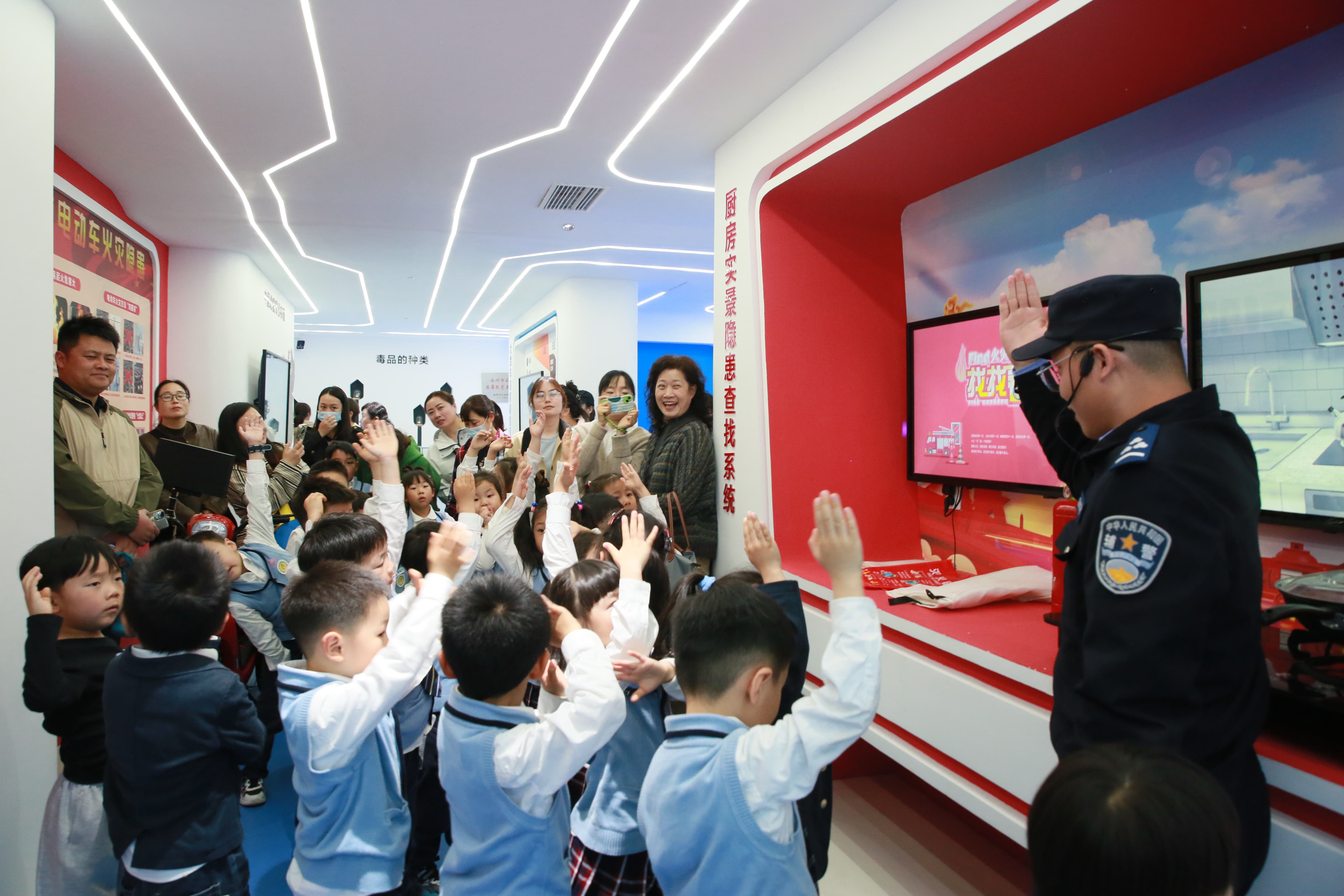 签约仪式后,一场别开生面的沉浸式安全教育在中三班萌娃的研学之旅中展开。在“平安护苗”教育基地,孩子和家长们在张警官指导下开启安全探秘之旅。