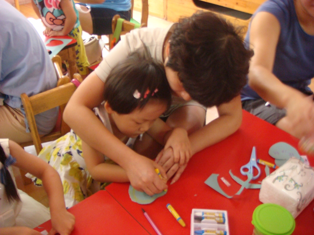 我们在做胸牌哦,上面有我的大头贴和名字呢!