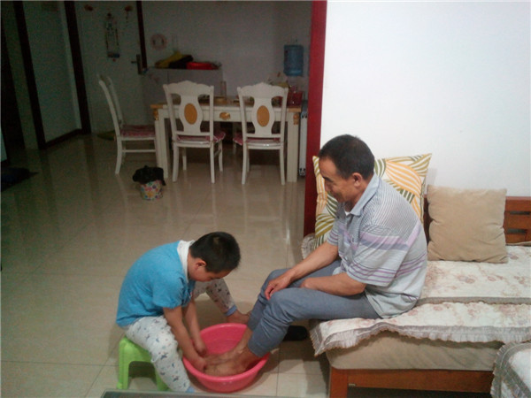 爷爷教育要我小朋友从小要学会尊敬老人,做个懂礼貌的好孩子,这不,我为爷爷洗洗脚。